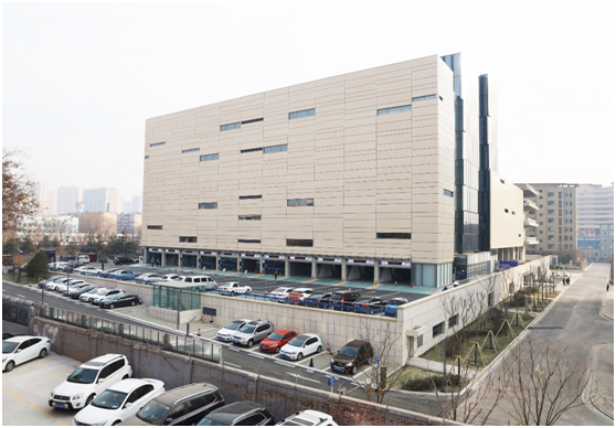 學府智能停車樓位于塢城路與學府街交叉口西北角,該項目建筑面積17908.41平方米,總高度為38.75米,分為南北兩個庫,南庫停車層13層,北庫停車層11層,共計1204個停車位,其中機械停車位918個,室外停車位118個,商務樓地下兩層停車位168個。樓體設置11個相互獨立的進口和出口,實現了獨立連續存取車輛。