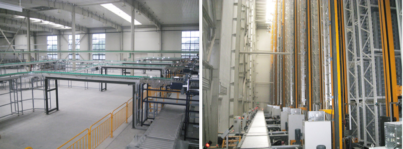 The system starts from the box-sealing section, including box delivery system, robot palletizing, front-and-back warehouse transportation, automatic 3D warehouse system (including WMS/WCS/MFC system), picking system, supply and transport of value-added products stomp assembly, LED display screen, bar code system, packaging material information system, computer monitoring system, regional network and communication system etc.